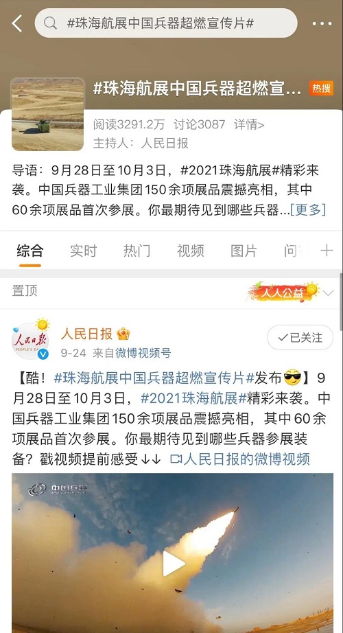 人民日報、新華社、中國日報、共青團中央、國資小新、騰訊軍事、鳳凰軍事、新浪軍事等新媒體發(fā)布的集團公司航展宣傳片等視頻作品燃爆全網(wǎng),閱讀量突破三千萬(wàn)人次,得到外交部發(fā)言人趙立堅轉載點(diǎn)贊。集團公司微信、微博、抖音號、微信視頻號等新媒體宣傳片播放閱讀量超過(guò)400萬(wàn)人次。同時(shí),央視新聞、新華社、中國之聲、央視軍事、央視新媒體、解放軍報、共青團中央、國資小新、環(huán)球時(shí)報等多家媒體對集團公司靜、動(dòng)態(tài)展區進(jìn)行現場(chǎng)直播,在電視端、客戶(hù)端、微信視頻號、微博、B站、快手、抖音等平臺受到高度關(guān)注。著(zhù)名軍事專(zhuān)家杜文龍、央視主持人顧國寧、央廣中國之聲主持人王藝等直播兵器館、動(dòng)態(tài)表演區裝備。