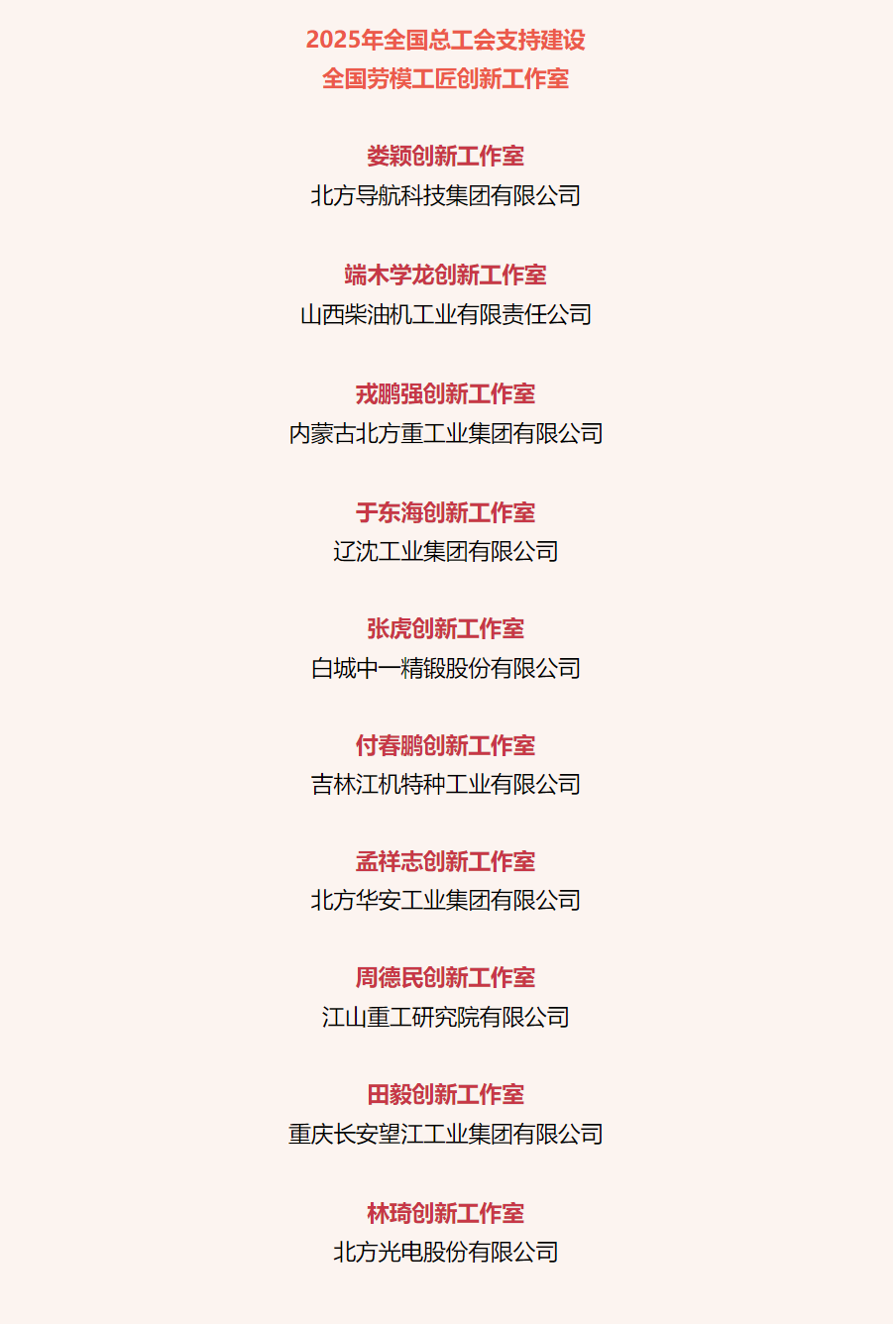 近日,中華全國(guó)總工會(huì)公布2025年全國(guó)總工會(huì)支持建設(shè)全國(guó)勞模工匠創(chuàng)新工作室名單,兵器工業(yè)集團(tuán)10個(gè)勞模工匠創(chuàng)新工作室獲全國(guó)總工會(huì)支持建設(shè)。